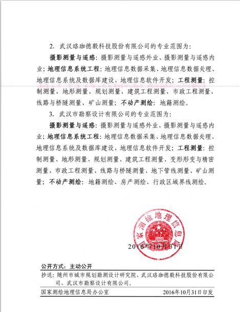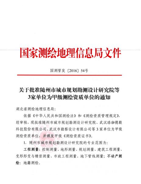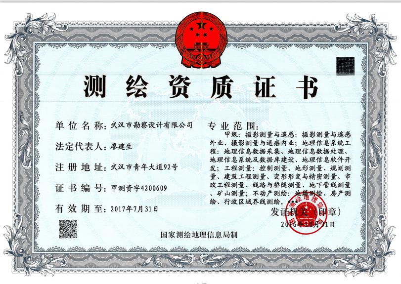 日前,經(jīng)湖北省測繪地理信息局審查推薦、國家測繪地理信息局審核批準(zhǔn),武漢市勘察設(shè)計有限公司榮獲甲級測繪資質(zhì)證書。自此我公司甲級測繪業(yè)務(wù)將全面覆蓋攝影測量與遙感、地理信息系統(tǒng)工程、工程測量、不動產(chǎn)測繪等專業(yè)范圍。